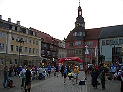 Gegen 5:35 Uhr, also weniger als eine halbe Stunde vor dem Start um sechs, scheint noch nicht einmal die Hälfte der knapp 1800 Läufer auf dem Markt in Eisenach zu sein, so leer wirkt der Platz. Kaum Menschen, die sich einlaufen. Nur einzelne dehnen sich bereits. Kleine Menschengruppen stehen beieinander, unterhalten sich, begrüßen neu Ankommende, die so die Gruppen langsam wachsen lassen. Erste beginnen sich umzuziehen.