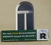 Dann das freundliche Schild „Nur noch 72 Kilometer bis Schmiedefeld! EISENACH wünscht ALLES GUTE!“, wirklich sehr nett, „nur noch 72 Kilometer“, sagenhafte 700 Meter sind bereits hinter uns. Aber allmählich ist es auch mit der Freundlichkeit vorbei … und es wird ‚gefährlich‘!