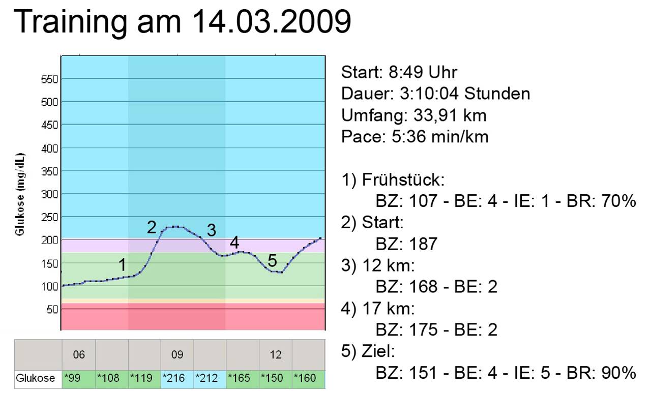 Dahinter steckt eine Gesetzmäßigkeit, die sich bei mir auch bei kürzeren Einheiten und anderen Sportarten bestätigt: Morgens ist eine deutlich geringere Therapieanpassung nötig als mittags, nachmittags oder am frühen Abend, d. h. ich benötige morgens weniger Sport-BE und eine geringere Basalratenreduktion … wenn ich überhaupt meine Therapie anpasse, denn kurze Läufe bis zu einer halben Stunde Dauer, zu denen ich direkt nach dem Aufstehen starte, kann ich nüchtern (keine Sport-BE) und ohne Anpassung der Basalrate absolvieren.