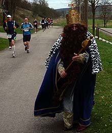 Kurz darauf passieren wir die Barbarossa-Höhle und tatsächlich ist der schlafende Kaiser aufgewacht, hat sich aus seinem unterirdischen Schloss bequemt und steht anfeuernd mit seinem langen roten Bart in majestätischer Erscheinung an der Strecke!