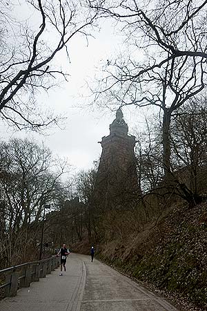 Und hier macht das Laufen richtig Spaß: Da stellt sich eine Wurzel in den Weg, dort greift ein Ast nach den Läufern, hier öffnet sich ein fantastischer Blick in ein Tal, weiter vorne sieht man einen großen Stausee, mal geht es bergauf, dann wieder bergab und irgendwann, etwa zur Hälfte der Strecke, steht man vor dem großen Kyffhäuser Denkmal, das – wer hätte das gedacht – neben Kaiser Wilhelm I. auch unseren kaiserlichen Läuferfreund feiert.