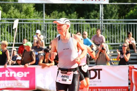 In der Wechselzone wird deutlich, dass die Ruhe trog, es herrscht reges Treiben: Rad auspacken, prüfen, aufpumpen und herrichten, Trinkflaschen füllen, Wechselzone einrichten, Kleiderbeutel abgeben, Dixi aufsuchen, Freunde begrüßen und Glück wünschen, den Körper mit Sonnencreme und Vaseline einreiben, den Neo anziehen, Badekappe auf und Schwimmbrille an … und schon ist es kurz vor Sieben und meine 200-köpfige Startgruppe wird aufgerufen. Wir trippeln zum Start, steigen die Stufen ins Wasser, schwimmen bis zur Startlinie und „Bumms“, mit einem lauten Knall geht es los.
