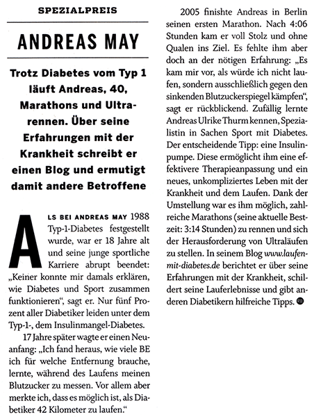 Ich kann es kaum glauben: Die Redaktion der Runner’s World hat mich im aktuellen Heft Dezember 2010 neben Verena Sailer (Kategorie Elite), Corinna Harrer (Kategorie Nachwuchs), Marc Löhmann (Kategorie Trainer) und Sigrid Eichner (Kategorie Masters) zu einem ihrer fünf Laufhelden 2010 ernannt. Verliehen wurde ein Spezialpreis, der zum einen meine Ausdauerleistungen würdigt, die ich der Diabetestherapie abtrotze (denn das subkutan verabreichte und nur verzögert resorbierte Insulin ist das Hauptproblem beim Sport, mit dem es umzugehen gilt, nicht der Diabetes an sich), zum anderen aber auch das Engagement auszeichnet, mit dem ich andere motiviere, trotz Diabetes weiter Sport zu treiben, und ihnen ein wenig dabei helfe, dieses auch umzusetzen.