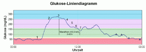 Ziele dieser Absenkung waren durch einen niedrigen Insulinspiegel den Fettstoffwechsel anzukurbeln sowie der Gefahr einer Hypo zu begegnen (die ja durch die noch wirkenden Boli verstärkt wird), die Anhebung eine dreiviertel Stunde vor dem geplanten Zieleinlauf sollte dem bei mir typischen Nach-Sport-Anstieg entgegenwirken.