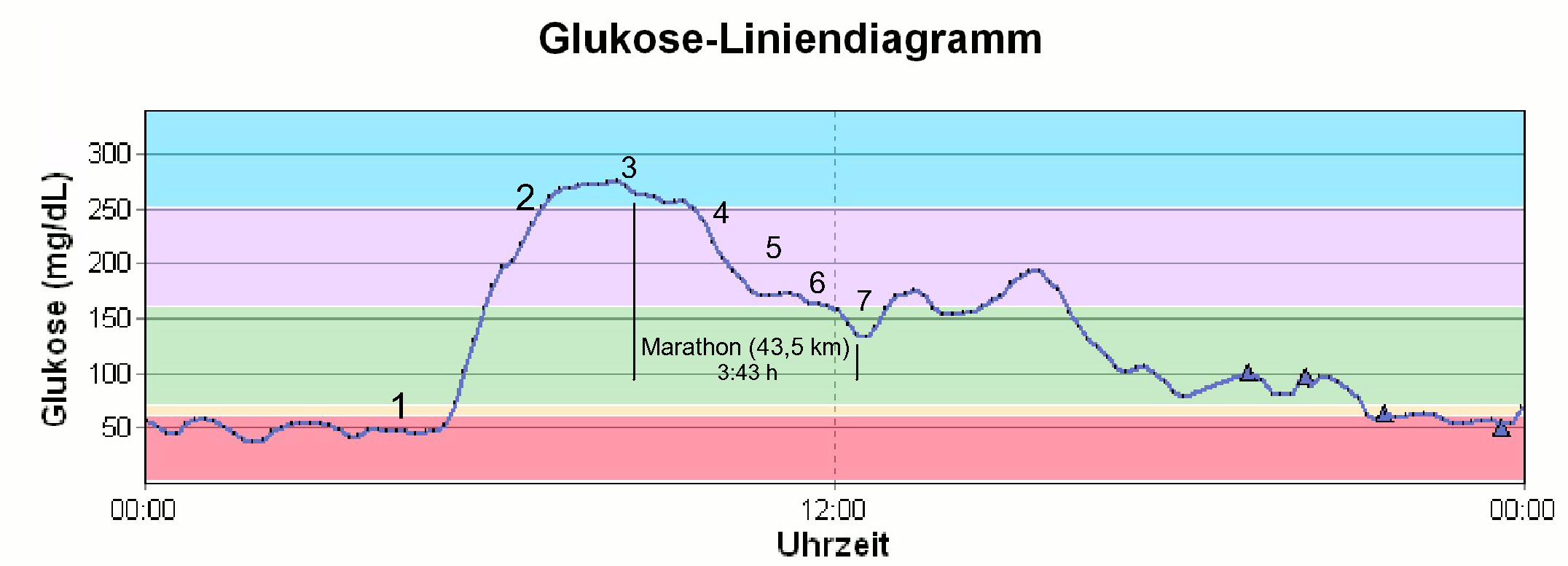 Diverse Nahrungsaufnahmen (Protein-Riegel, Bratwurst mit Brötchen, Bier) werden mit Boli abgedeckt und erklären die Anstiege, ehe im Verlauf des Nachmittages der Muskelauffülleffekt für eine deutlich fallende Tendenz sorgt.