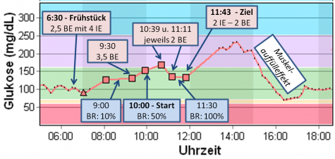 Nur im Ziel, da habe ich zuviel geschwätzt und mich nicht auf das konzentriert, was nötig ist, nämlich einen Bolus abzugeben, der nicht nur die Zielverpflegung abdeckt, sondern den für mich typischen Anstieg im Ziel bremmst. Aber das ist schnell korrigiert und im Zusammenspiel mit dem Muskelauffülleffekt normalisiert sich der Blutzucker schnell.