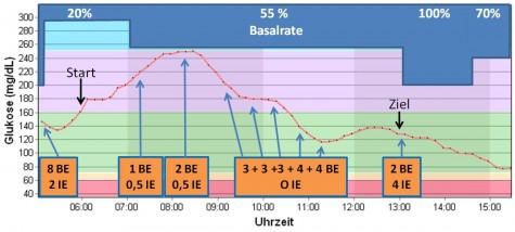 Im Ziel begegne ich den 2 BE der Zielverpflegung mit einem erhöhtem Bolus von 4 IE und einer zwischenzeitlichen Basalrate von 100%. Dabei stoppen die zusätzlichen 2 IE den bei mir typischen Anstieg im Ziel erfolgreich.