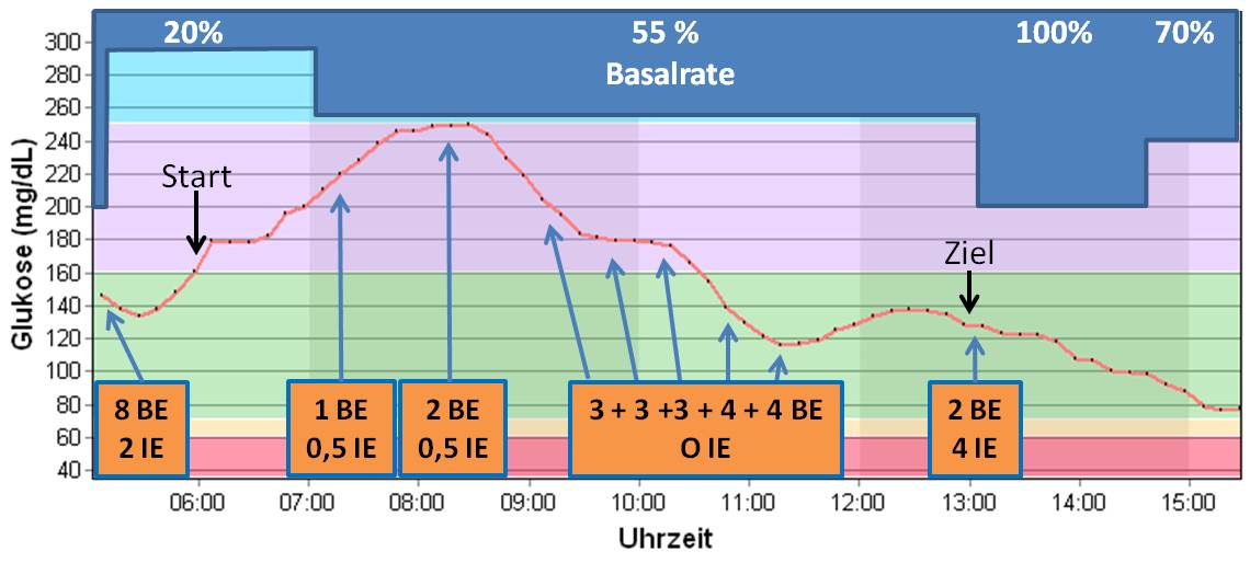 Erst nach einer Weile wirkt sich der Muskelauffülleffekt aus, sodass ich meine Basalrate wieder absenke: Mit 70% vermeide ich auch während der Nacht die ein oder andere drohende Hypo.